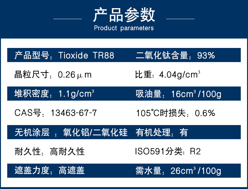产品型号:Tioxide TR88 二氧化钛含量: ≧93% 晶粒尺寸:0.26μm 比重: 4.05g/cm³ 堆积密度:1.1g/cm³ 吸油量:16cm³/100g 105℃时损失:≤0.6% 有机处理:是 无机涂层 :氧化铝/二氧化硅 耐久性:高耐久性 ISO591分类: R2 遮盖力度:高遮盖 需水量:26cm³/100g